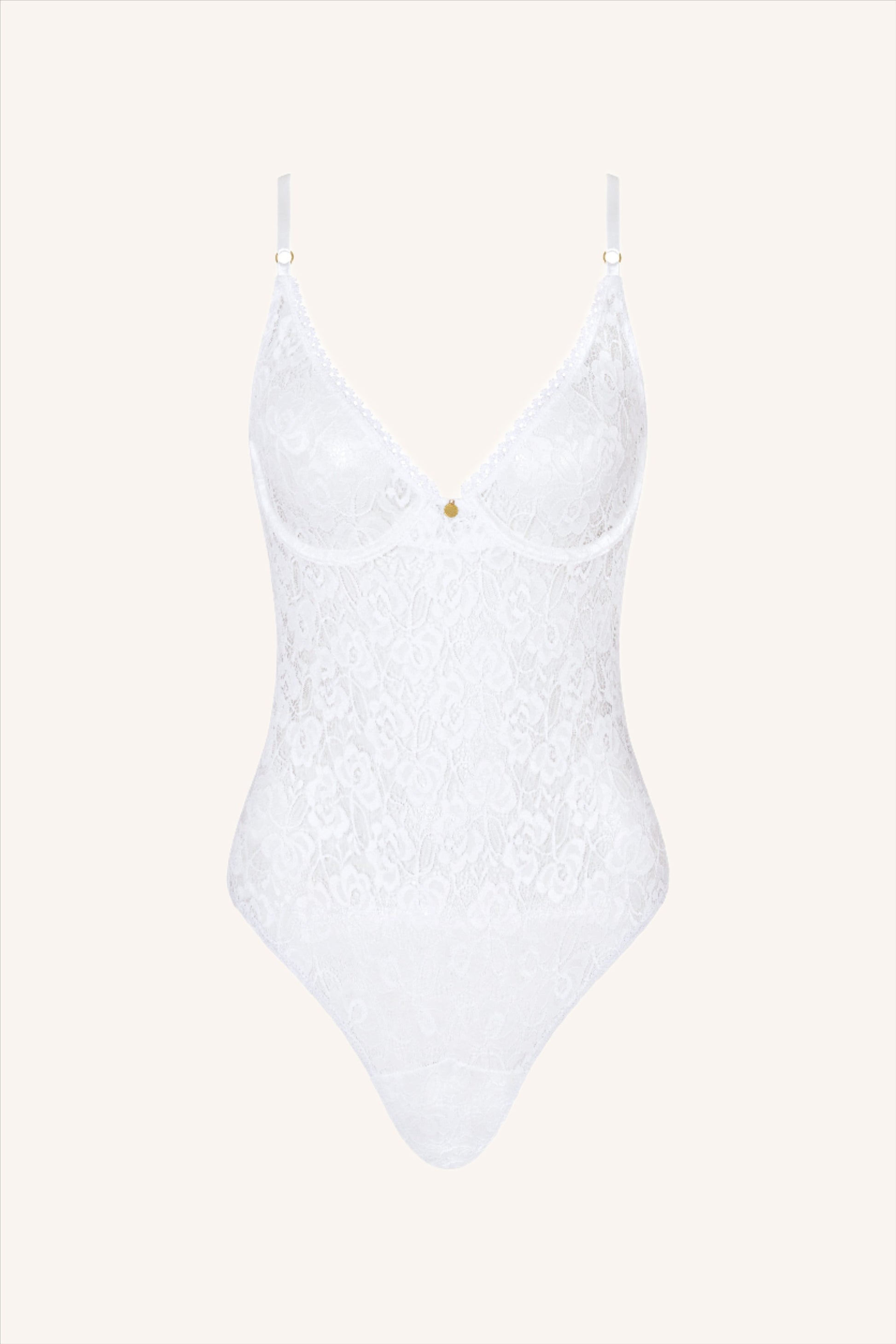 De Mon Cheri White Bodysuit is een tijdloze mix van zachtheid en elegantie. De witte bloemenkant omhult je huid met subtiele verfijning, terwijl de beugels zorgen voor natuurlijke steun zonder vulling. De picot-afwerking en gouden accenten geven dit stuk een luxueuze uitstraling – perfect om te loungen, te layeren of stijlvol te combineren met een blazer of rok.