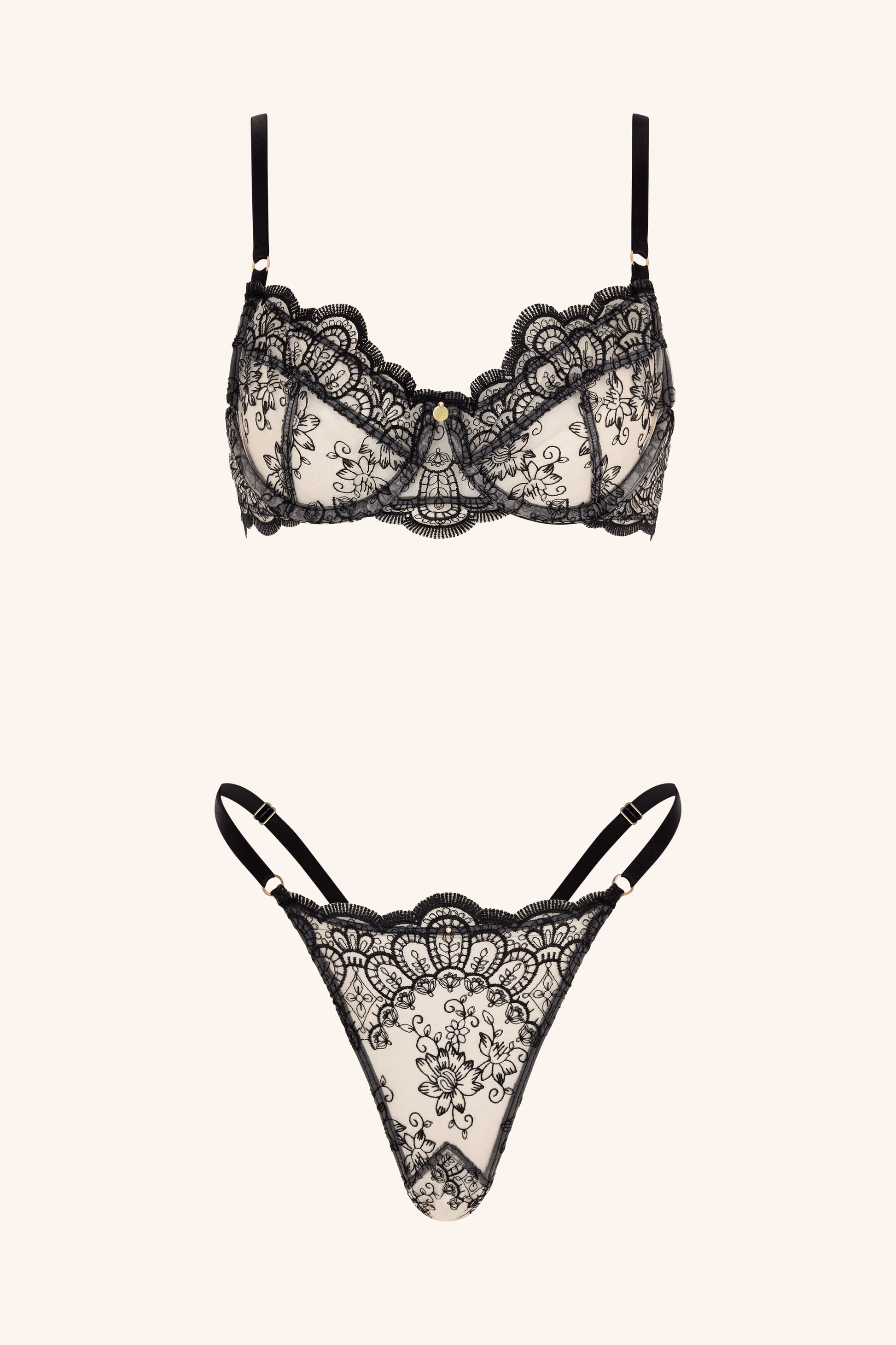 De Amore Bh in zwart is gemaakt van fijn bloemvormig kant dat je huid subtiel laat doorschemeren. De demi cups met beugels bieden natuurlijke lift en ondersteuning, terwijl de handgesneden scallop-randen zorgen voor een verfijnde, luxueuze afwerking. Perfect voor wie comfort en verleiding in perfecte balans wil ervaren.