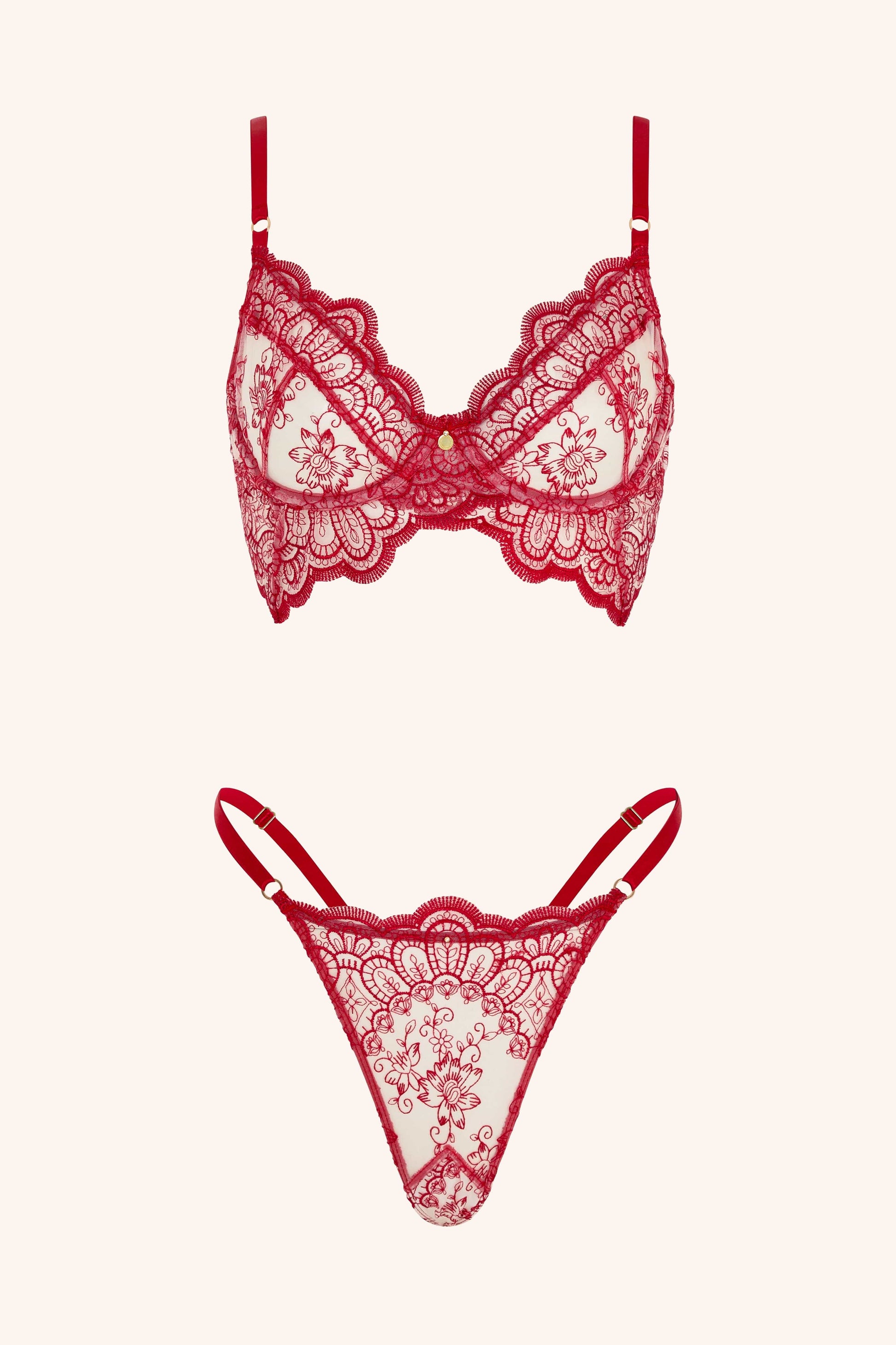 De Amore Bh in rood combineert een flatterende longline pasvorm met elegante, doorschijnende geborduurde mesh. De beugels bieden subtiele ondersteuning terwijl de zachte, niet-gewatteerde cups je natuurlijke vorm benadrukken. De handgesneden kanten randen met verfijnde scallop-afwerking voegen een luxueuze, vrouwelijke touch toe. Afgewerkt met gouden details voor een onweerstaanbare, high-end uitstraling.