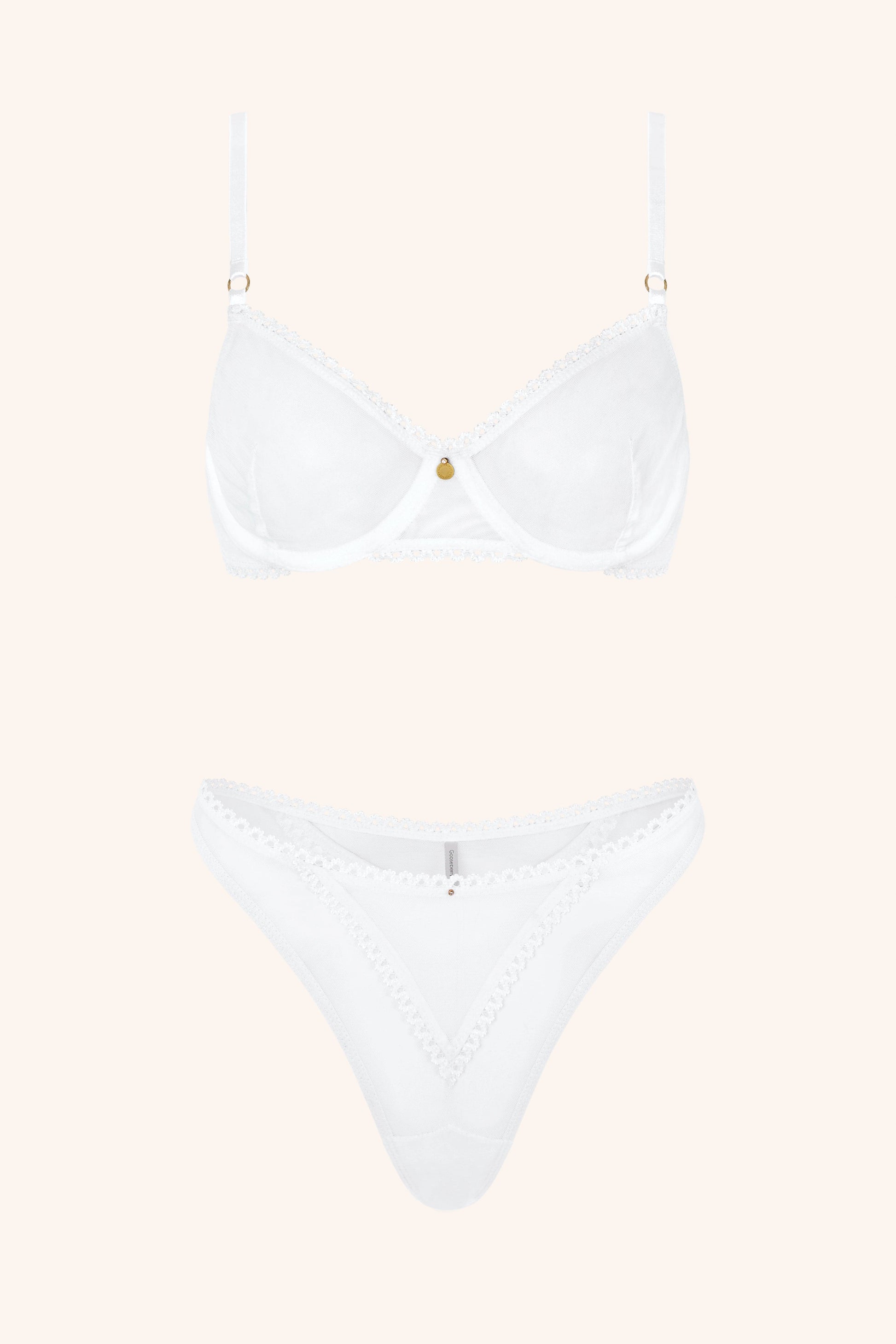De Dolce Bh in wit straalt elegantie en sensualiteit uit met transparante mesh en verfijnde details. De beugels bieden subtiele ondersteuning en shaping, terwijl de ademende stretch-mesh zacht en licht aanvoelt op de huid. Gouden accenten zorgen voor een luxueuze, verfijnde afwerking. Perfect voor vrouwen die comfort en klasse moeiteloos willen combineren.