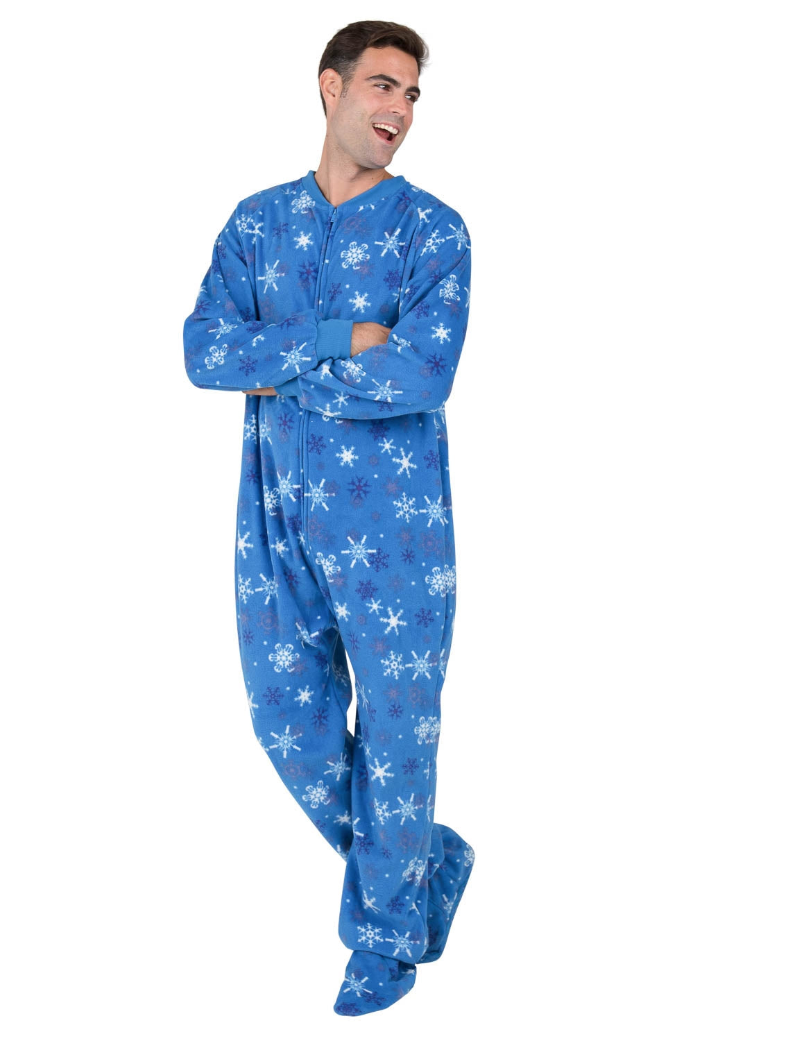 • White, blue and grey snow flurries dance around and fall over these winter blue footed pajamas for men and women. Ultra-cozy, soft polar fleece warms bodies and spirits on even the coldest and chilliest of days. Relax and lounge, or sleep wrapped up in amazingly comfortable and classic onesie pajamas.