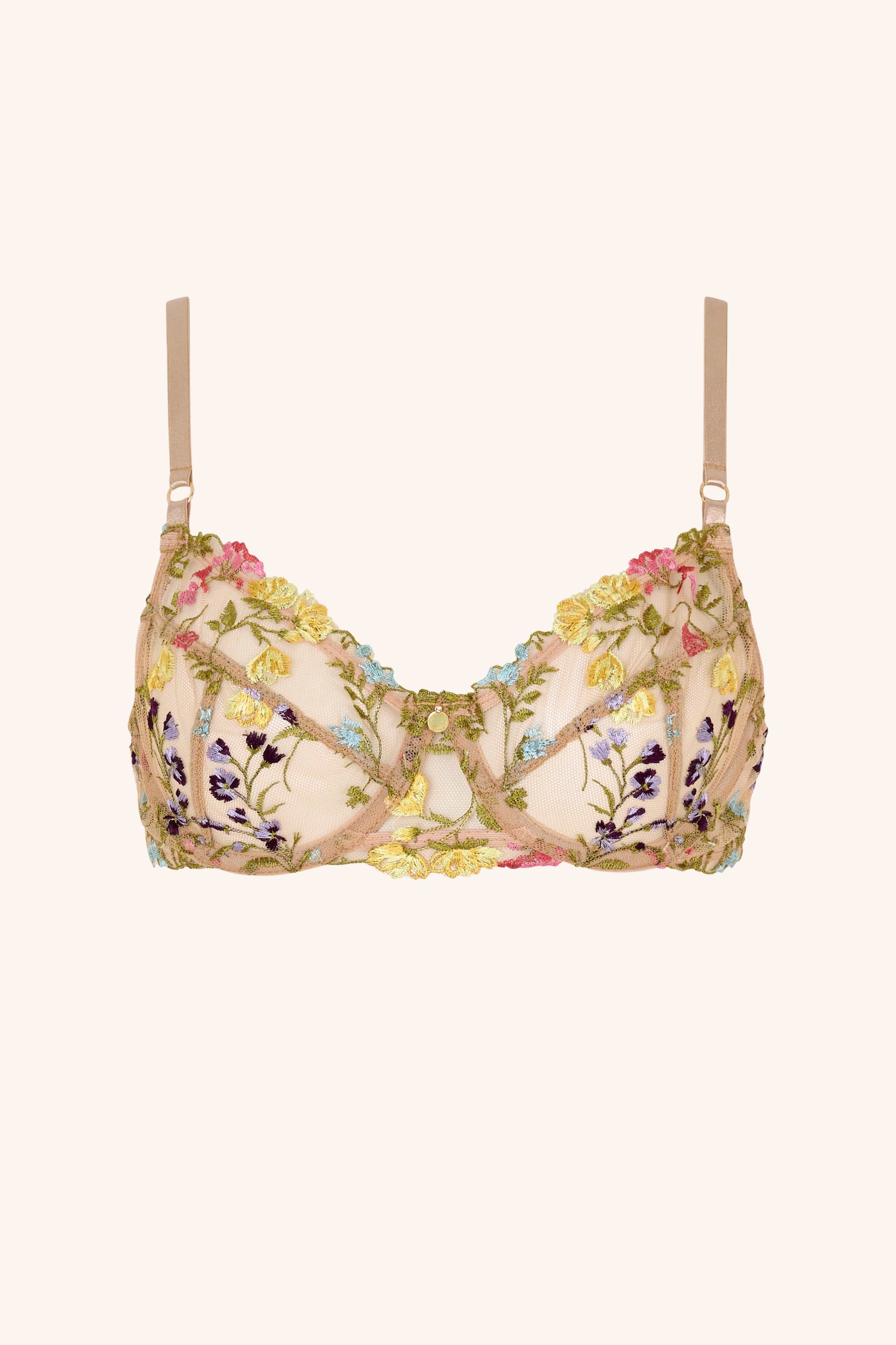 De Wildflower Bh is geïnspireerd op de natuurlijke schoonheid van wilde bloemen en afgewerkt met fijn bloemvormig borduurwerk op zachte, transparante mesh. De demi cups met beugels bieden natuurlijke ondersteuning zonder vulling, terwijl de handgesneden scallop-randen zorgen voor een verfijnde, dromerige afwerking. Een vleugje romantiek dat elke lingerielade laat bloeien.